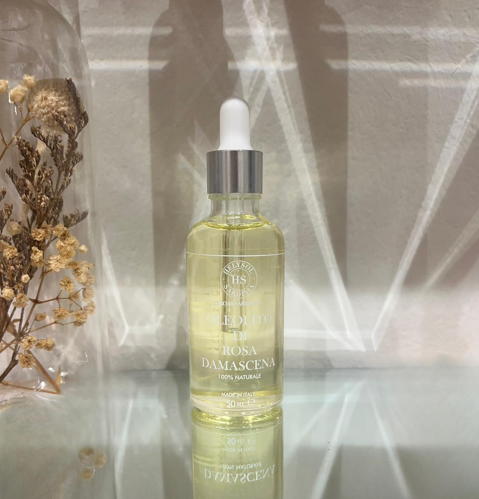 Oleolito di Rosa Damascena, prodotto tramite la macerazione in olio di girasole dei petali di rosa damascena, al buio, per 40 giorni.